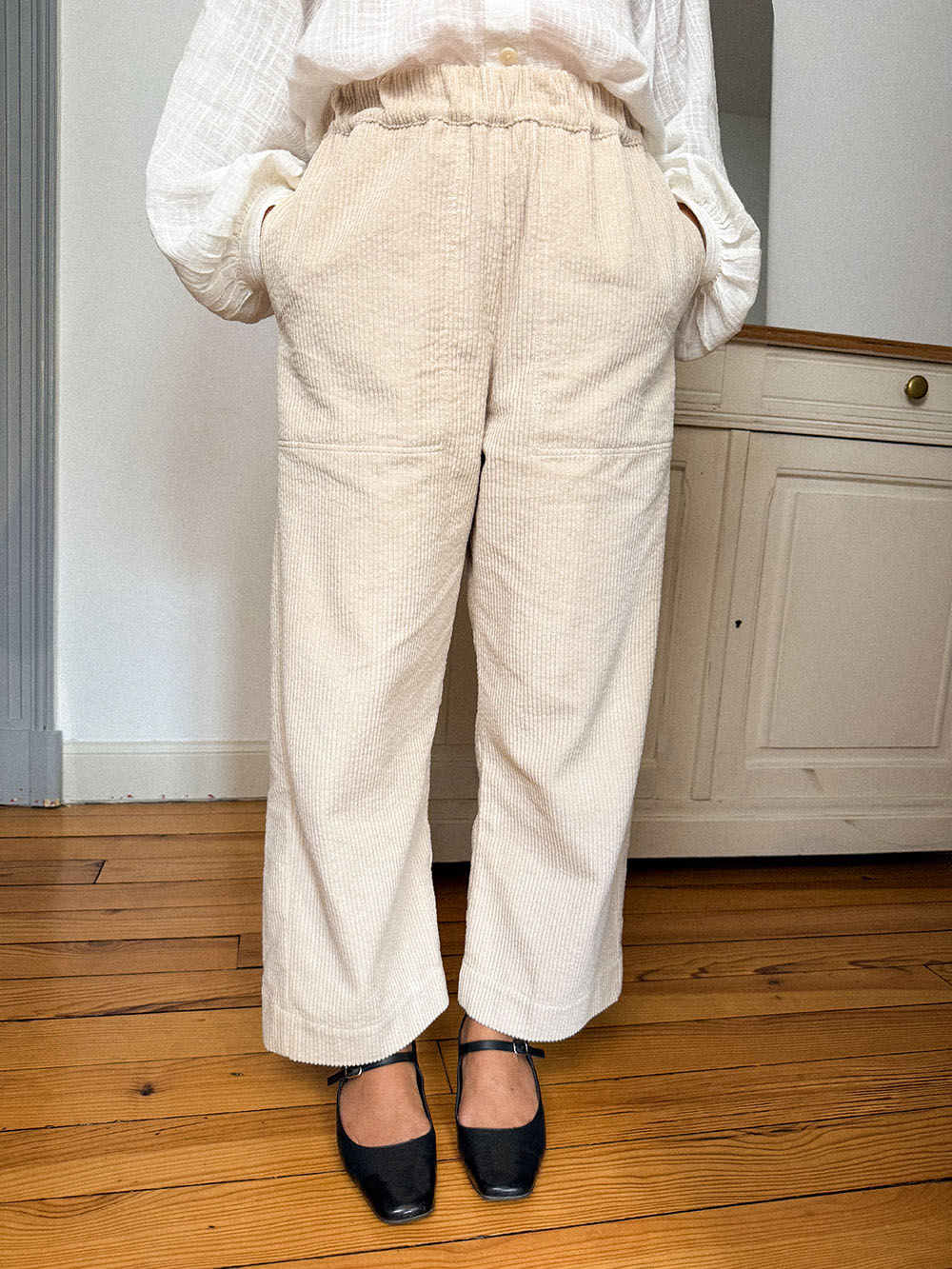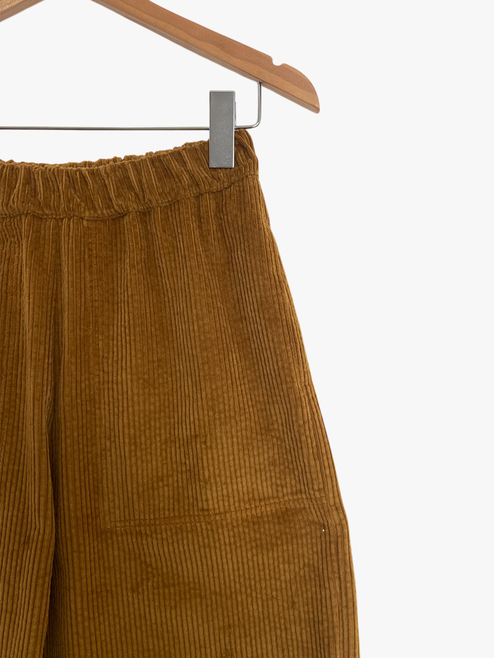 Le pantalon Ficus est en velours de coton 500 raies couleur havane, c’est un joli marron cuivré chaud. Sa coupe large et confortable est rehaussée d’un élastique à la taille.